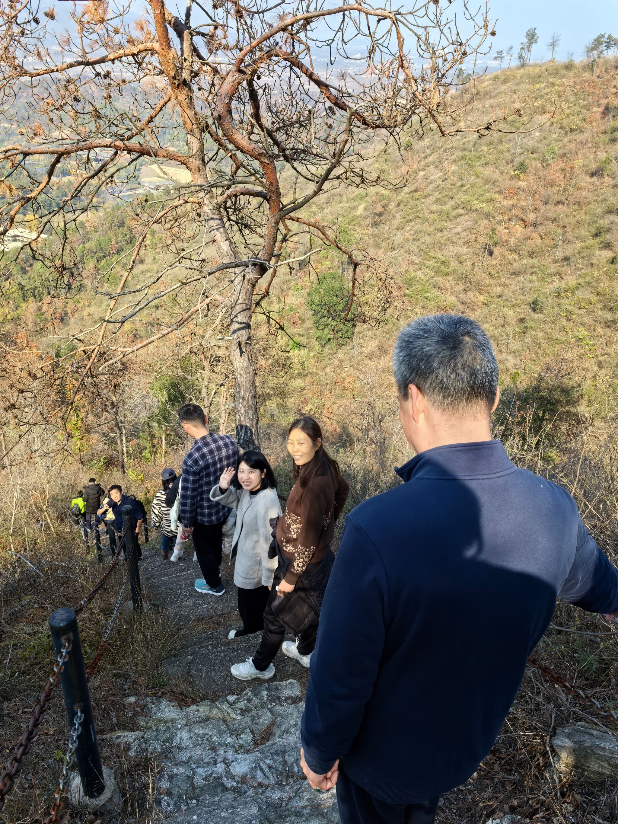 山路陡峭,大家不时停下来等待“掉队”的伙伴们,在登顶的时候拍下了无比自豪的照片。立于白龙山巅,极目远眺,山水广袤无垠,秋意正浓,杜鹃、海棠竟反季绽放,大家探寻着古村寨遗址,不时举起手机,欲将这份美好永远定格。